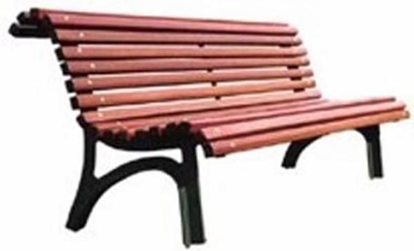 O banco que aparece na foto é de madeira escura.