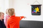 Alvo magnético infantil imprimido por ambos os lados. Em um lado aparece um mapa da Europa e no outro um urso. Os dois têm marcadas as diferentes pontuações.