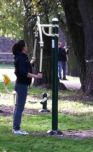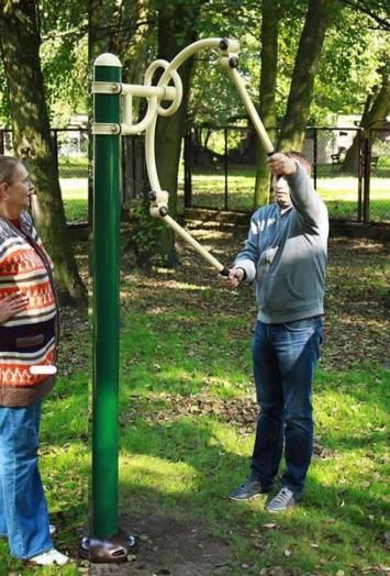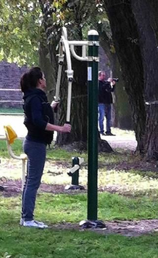 Forma de uso: O usuário de pé tem que agarrar as pegas e esticar-las.