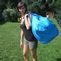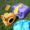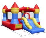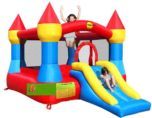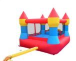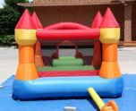 A entrada do Castelo insuflável está na parte lateral, salta-se no centro, e á saida pelo escorrega.