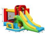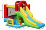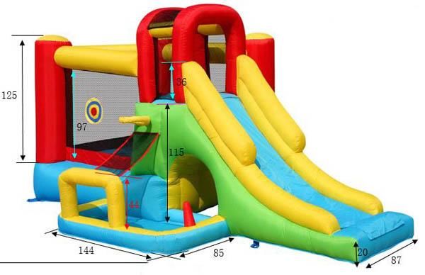 O castelo insuflável 8 em 1 tem muitas atividades para manter as crianças entretidas em casa. Tem um escorrega grande, uma área espaçosa de salto, rampa de escalada, uma cesta de basquete, uma piscina de bolinhas, uma brinquedo com anéis e um alvo com dardos de velcro.