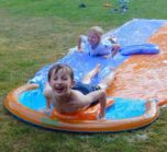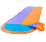 A mangueira conecta-se à pista do escorregador aquático, insuflam-se os colchoes e podem começar a fazer corridas divertidas deslizando pelo escorregador aquático.