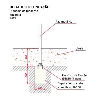 Esquema de como são as ancoragens para um solo de areia. Devem ser feitos blocos de betão e depois deixar 40 cm de areia não compactada. Deve-se passar um ancinho periodicamente para descompactar a areia.