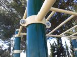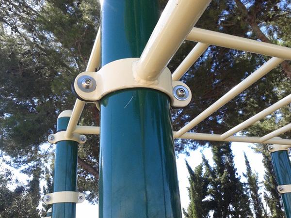 Postes de tubos redondos de aço galvanizado de 114 mm de diâmetro com uma base para a fixação. O resto dos tubos, também redondos, têm diâmetros diferentes: 32/38/48/60 mm.