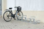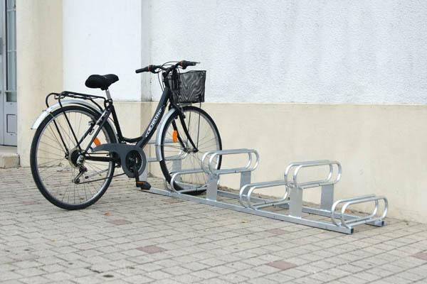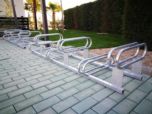 Estacionamento para bicicletas de seis espaços ao ar livre. Aparcabicicletas para adicionar extensões ao infinito.