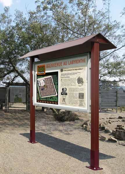 Painel de informações para exterior feito em madeira e aluminio para informar protegendo a informação num entorno rural perto da natureza (parques, trilhas na mata, resorts de esqui, parques de campismo ...)