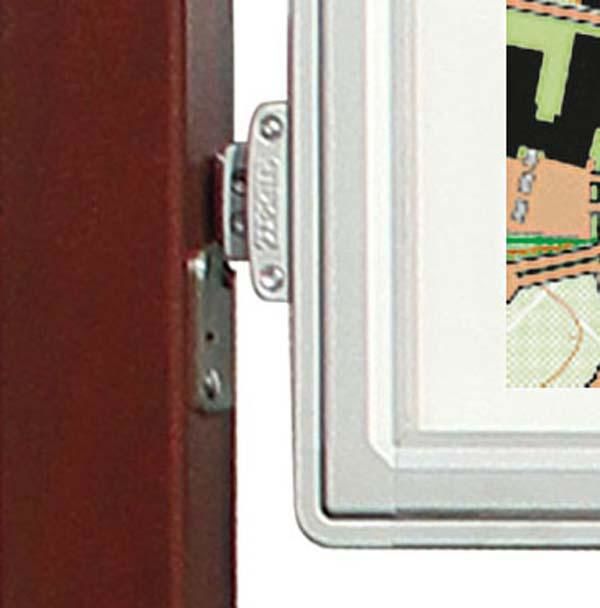 O painel de informações tem uma vitrine de um lado com um marco de aluminio de 75 mm de espessura. Os cantos arredondados de alumínio fundido.